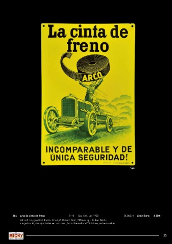 366 366 Arco la cinta de freno (1+) Spanien, um 1920 (6.000,-) Limit Euro: 2.000,- 40 x 60 cm, gewölbt, Ferro-Email, C. Robert Dold, Offenburg i. Baden, Motiv umgedruckt, die spanische Version des „Arco-Bremsband“ Schildes, extrem selten. 23