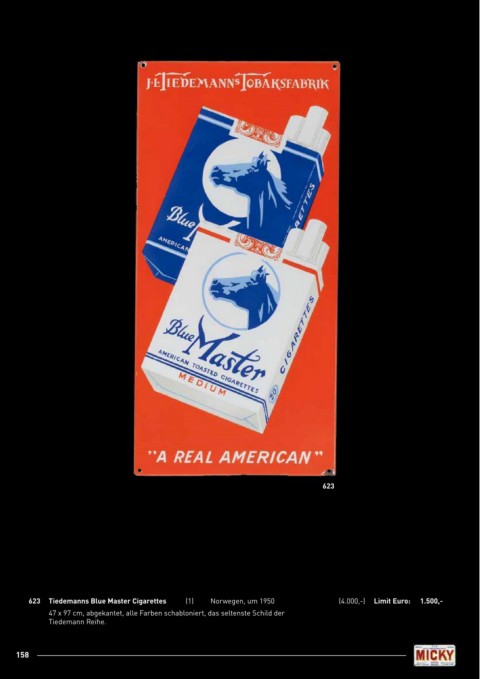 623 623 Tiedemanns Blue master Cigarettes (1) Norwegen, um 1950 (4.000,-) limit Euro: 1.500,- 47 x 97 cm, abgekantet, alle Farben schabloniert, das seltenste Schild der Tiedemann Reihe. 158