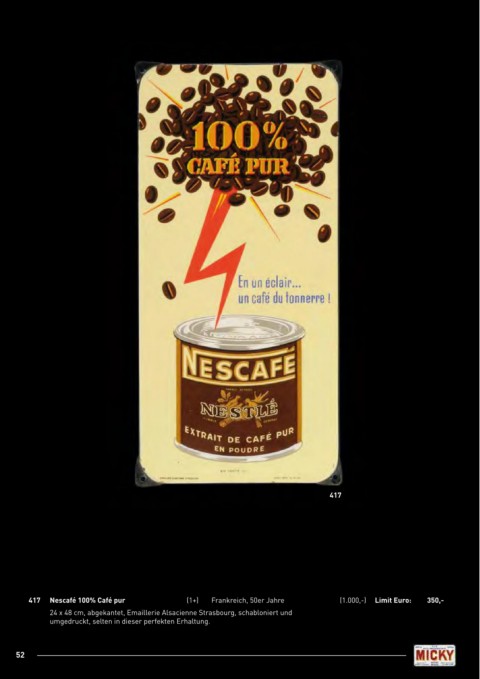 417 417 nescafé 100% Café pur (1+) Frankreich, 50er Jahre (1.000,-) limit Euro: 350,- 24 x 48 cm, abgekantet, Emaillerie Alsacienne Strasbourg, schabloniert und umgedruckt, selten in dieser perfekten Erhaltung. 52