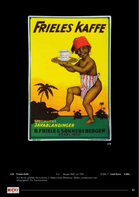 418 418 Frieles Kaffe (1+) Bergen (NO), um 1920 (5.000,-) limit Euro: 2.000,- 33 x 50 cm, gewölbt, Ferro-Email, C. Robert Dold, Offenburg i. Baden, schabloniert und lithographiert. Ein Traumzustand. 53