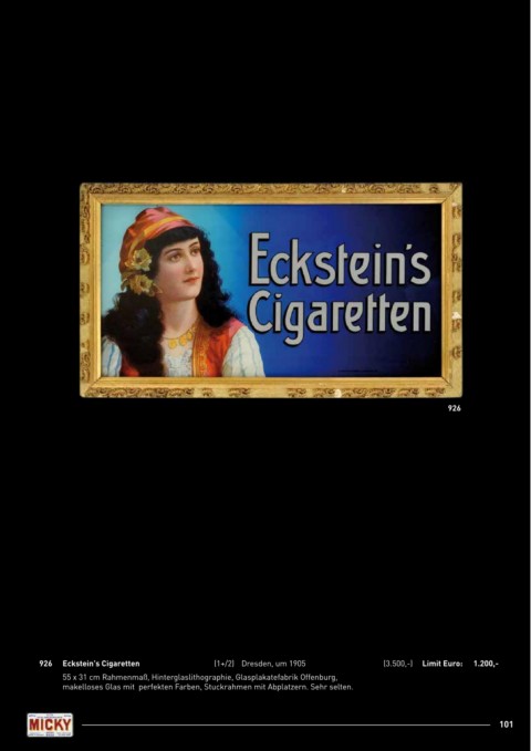 926 926 Eckstein’s Cigaretten (1+/2) Dresden, um 1905 (3.500,-) Limit Euro: 1.200,- 55 x 31 cm Rahmenmaß, Hinterglaslithographie, Glasplakatefabrik Offenburg, makelloses Glas mit perfekten Farben, Stuckrahmen mit Abplatzern. Sehr selten. 101