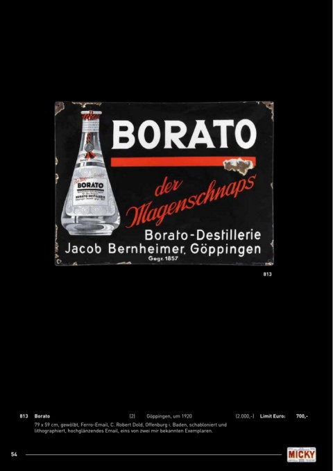 813 813 Borato (2) Göppingen, um 1920 (2.000,-) Limit Euro: 700,- 79 x 59 cm, gewölbt, Ferro-Email, C. Robert Dold, Offenburg i. Baden, schabloniert und lithographiert, hochglänzendes Email, eins von zwei mir bekannten Exemplaren. 54