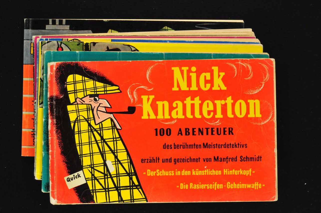 Nick Knatterton 1-7 komplett Band 1 (3-4), 2 (2/2-3), 3,(2), 4 (2), 5 (2-3), 6 (2) und 7 (1). Bände 1 und 6 sind Zweit-, sonst alles Erstauflagen. Die ersten 6 tragen einen Bibliotheksstempel auf den Vorsatzpapieren.