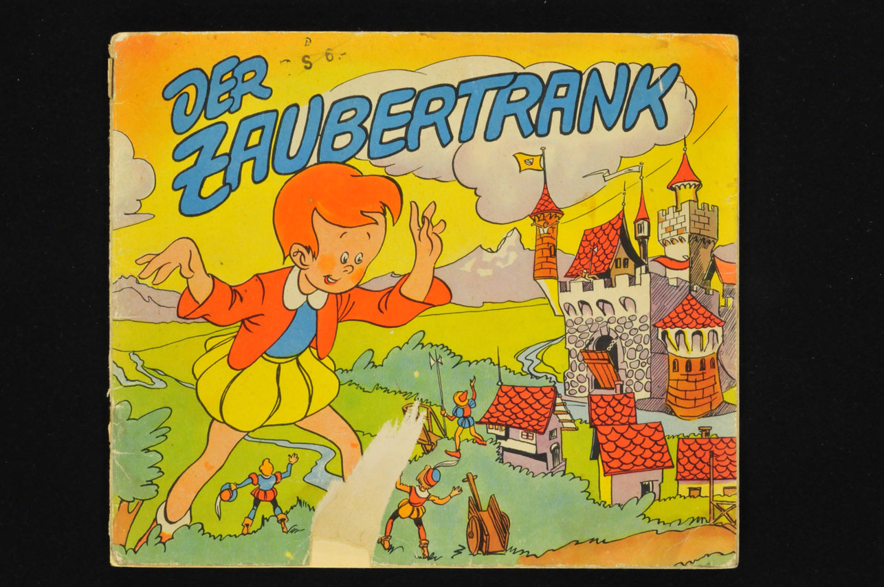 Ein Märchen-Buchfilm Nr. (1) auszog…. Querformatige Erstauflage. War mehrfach mit Klebebandstreifen geklebt, die aber wieder entfernt wurden, an Cover und Rückseite je eine Fehlecke, ein 5 cm Einriss und ein Kulistrich an der Unterkante. Bewertet als 3-4/4. Superselten!