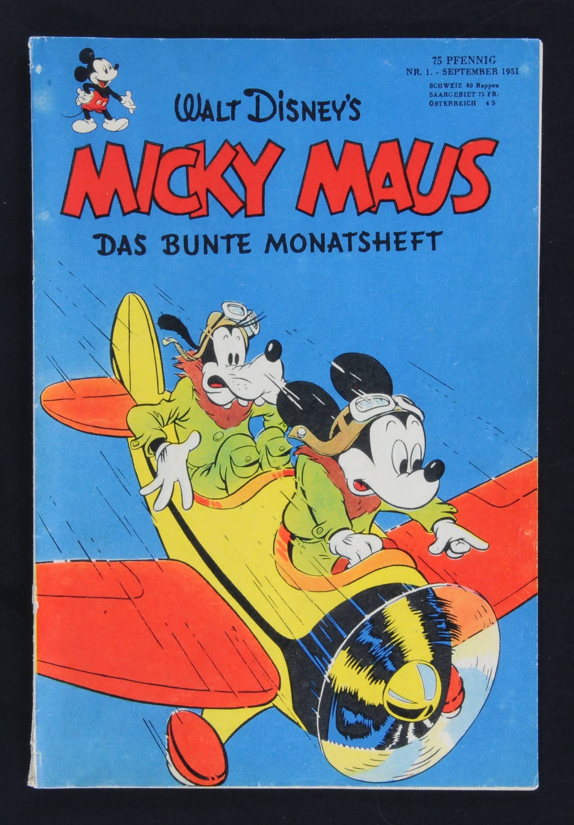 Micky Maus 1951 Nr. 1 Sicherlich immer noch ein gut anzuschauendes Heft, mit guter Substanz. Stäbchen eines Sammelordners haben hier die untere Falz u. die Mittelseite, ca. 2,5 cm geöffnet, die restlichen Seiten nur ca. 5 mm, die obere Falz u. die Mittelseite, sind ca. 1 cm offen, der Rest der Seiten ist hier nicht betroffen. Ein kleiner Falzplatzer als ein kleiner Einriss im unteren Rand innen aber keine Basteleien, Tesaklebungen, Stempel, Namenszüge etc. unbedingt vorbesichtigen, da optisch noch fein u. vom Fachmann noch gut herzurichten.