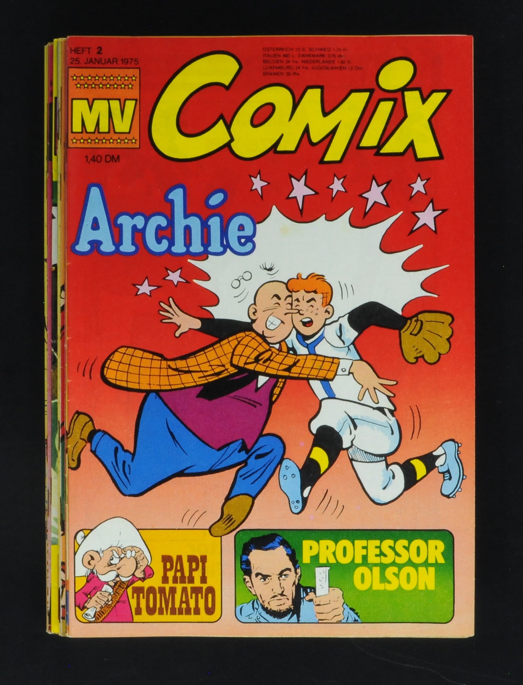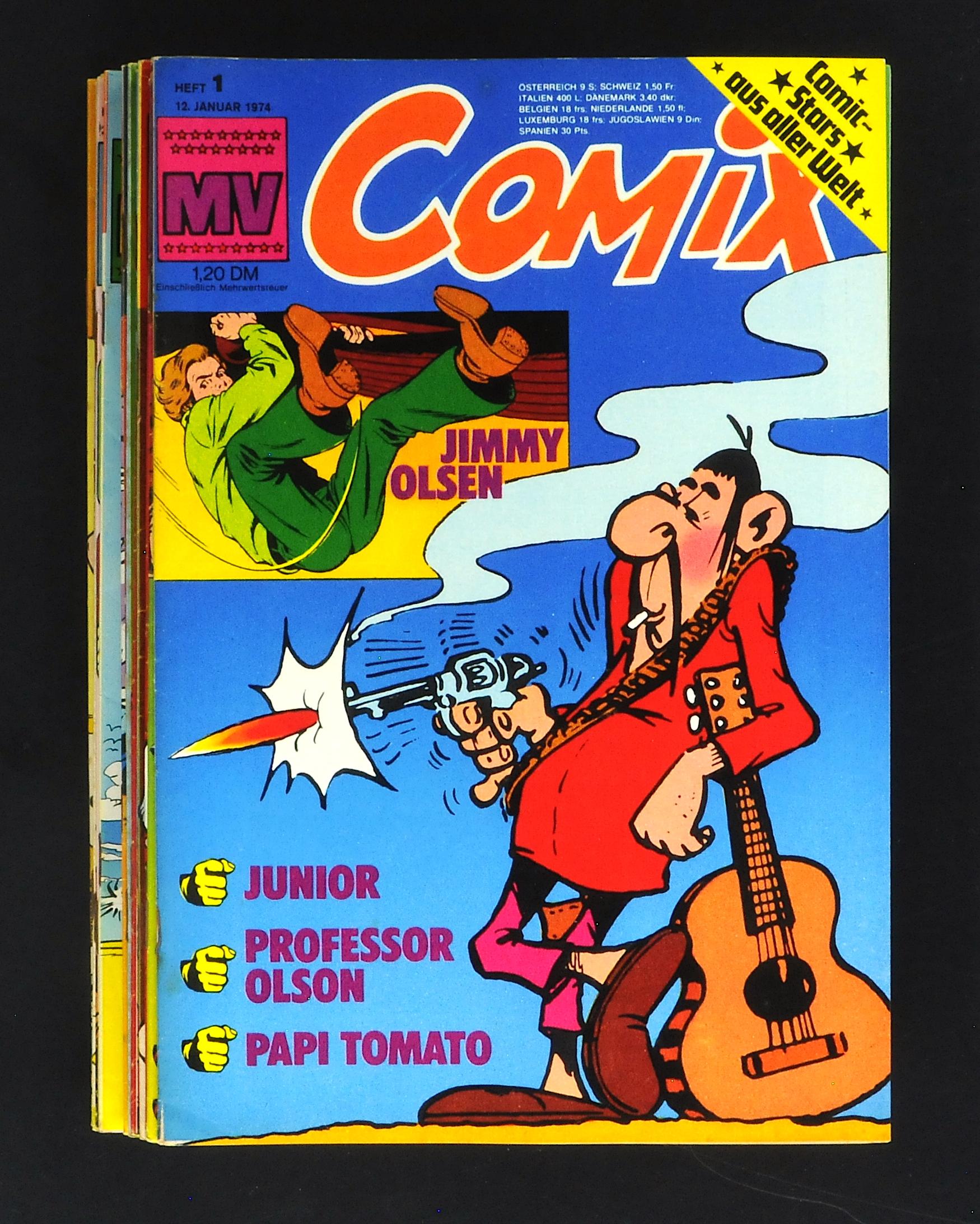 Mickyvision (M.V.) 1974 Konv. 25 Stk. Hefte 1, 3-26 um (1-2), ebenfalls tolle Hefte mit meistenteils wunderschöner Coveroptik und neuwertiger Papierspannug, Lagerflecken, leichter Klammerrost als Aneckungen sind vorhanden, Heft 4 mit der Felix Tomato Maske.