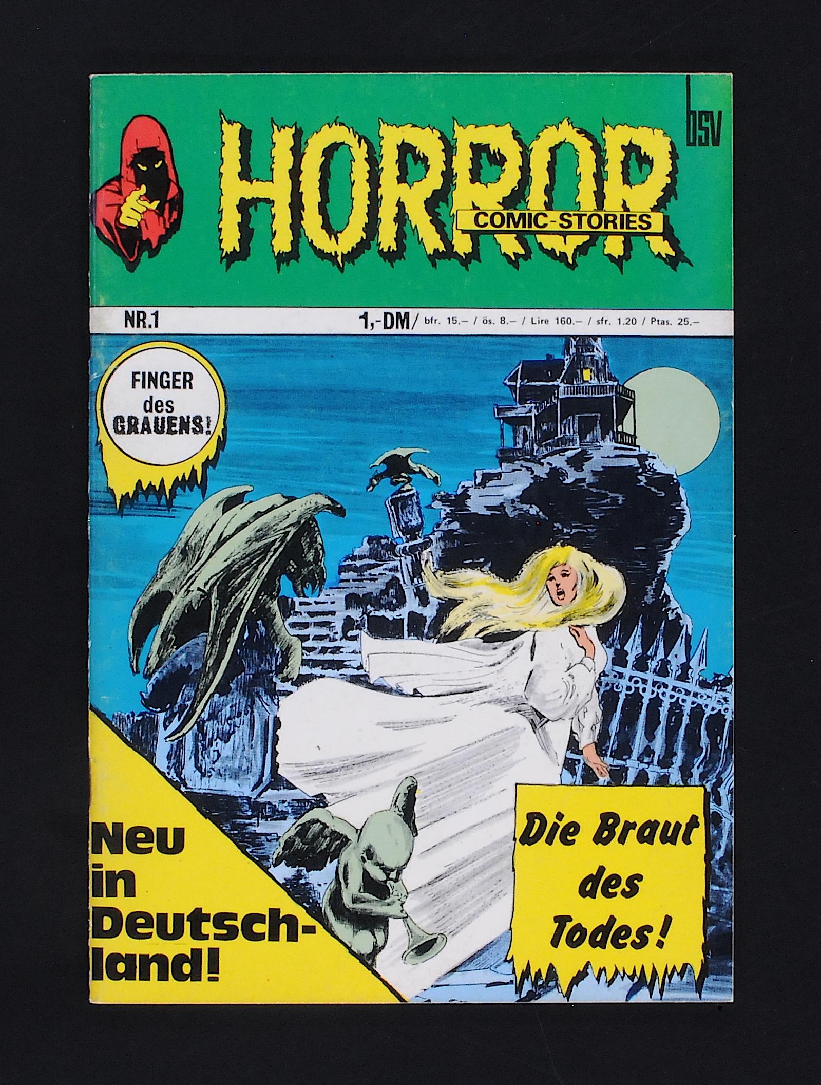 Horror Nr. 1 Schöne Anfangsnummer, lediglich am Falz eine zarte Farbaufhellung, der Falz zart berieben, bzw. einige, wenige Farbblitzer, leider befindet sich an der oberen Aufgangsecke der Rückseite ein kleines Eselsöhrchen, das dem, ansonsten immer noch fein wirkenden Heft eine bessere Bewertung verwehrt, in Gänze ein feines Heft, mit nahezu neuwertiger Papierspannung, eine Vorbesichtigung lohnt!