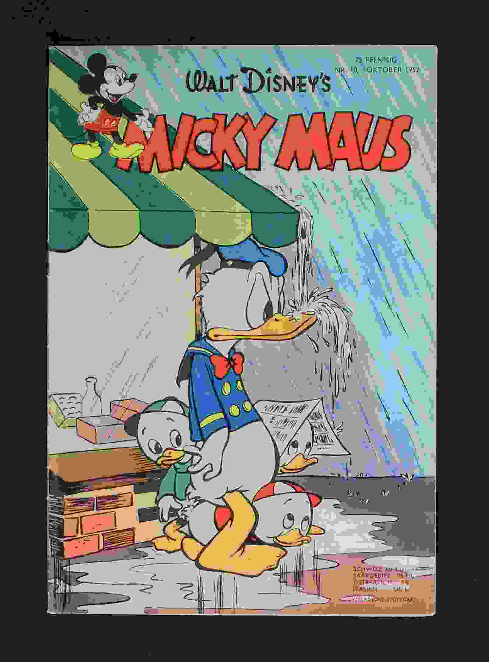 Micky Maus 1952 Nr. 1 Substanziell sogar besser aber ein Flüssigkeitsrand unten, neben dem Falz, der hier nicht von Kakao oder O-Saft stammt, da dieser innen keinerlei Verfärbungen zeigt, ein leichter Lesebug, Blitzer am Falz, in der Senkrechten eine kleine Bugspur, eines zu stramm eingestellten Druckrollenrades, an den Mittelseiten wieder der Abrieb eines Sammelordnerstäbchens, kleine Druckspuren Aneckungen, wenig Kantenblitzer kommen vor.