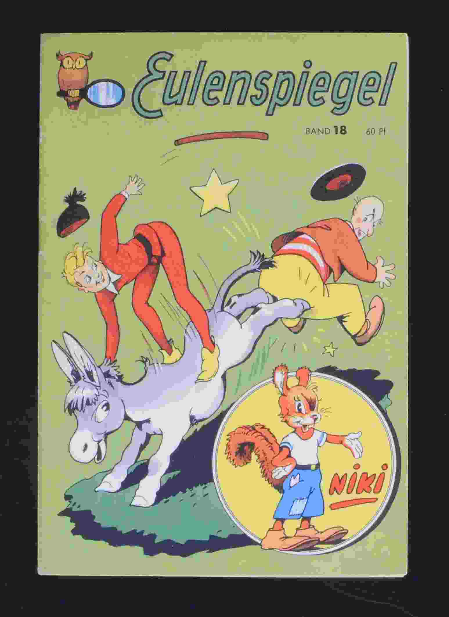 Micky Maus 1951 Nr. 4 Ein zarter Lagerbug dort auch einige Falzblitzer, am Aufgang als am unteren Rand, einige mini Einrisse, die Mittelseite zeigt die Abriebspur eines Sammelordnerstäbchens, die Falz der Mittelseite ist dadurch unten ca. 1 cm offen, die Öffnung ist an einigen Folgeseiten, stark vermindert noch vorhanden. Ein kleiner, unscheinbarer Flüssigkeitsrand am Innencover als kleine Einrisse am unteren Einschussloch der Mittelseite sind zu erspähen, Stempel, Tesaklebungen, Namenszüge etc. sind nicht vorhanden.