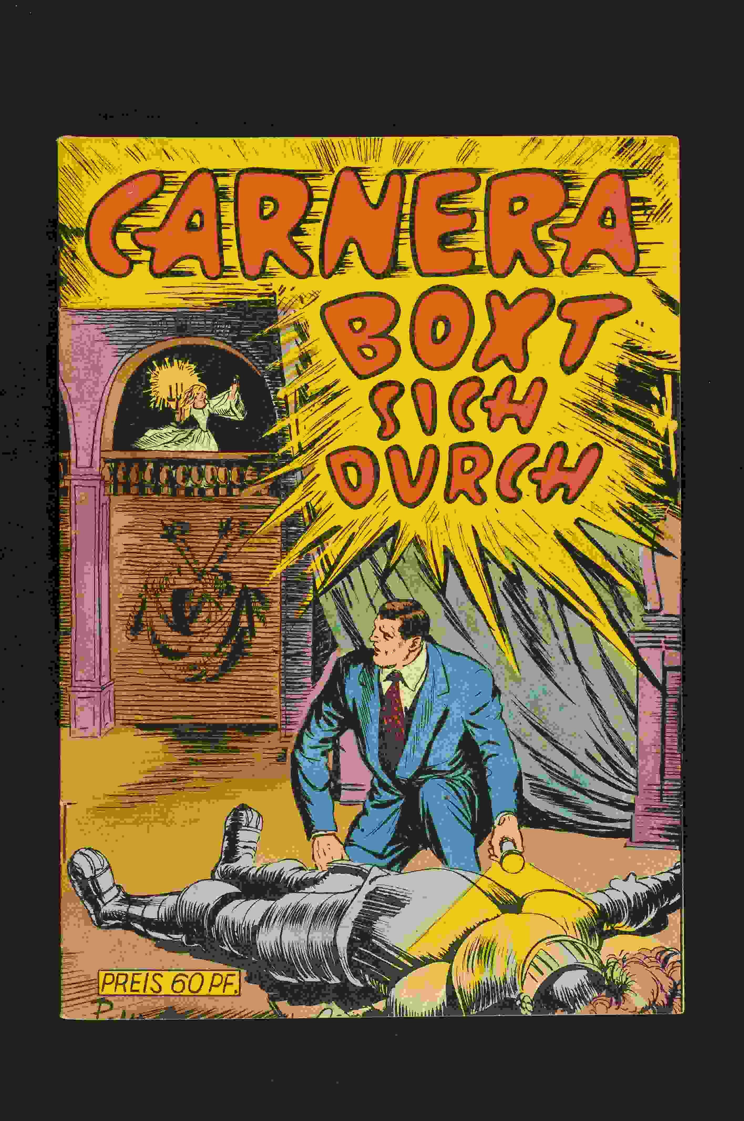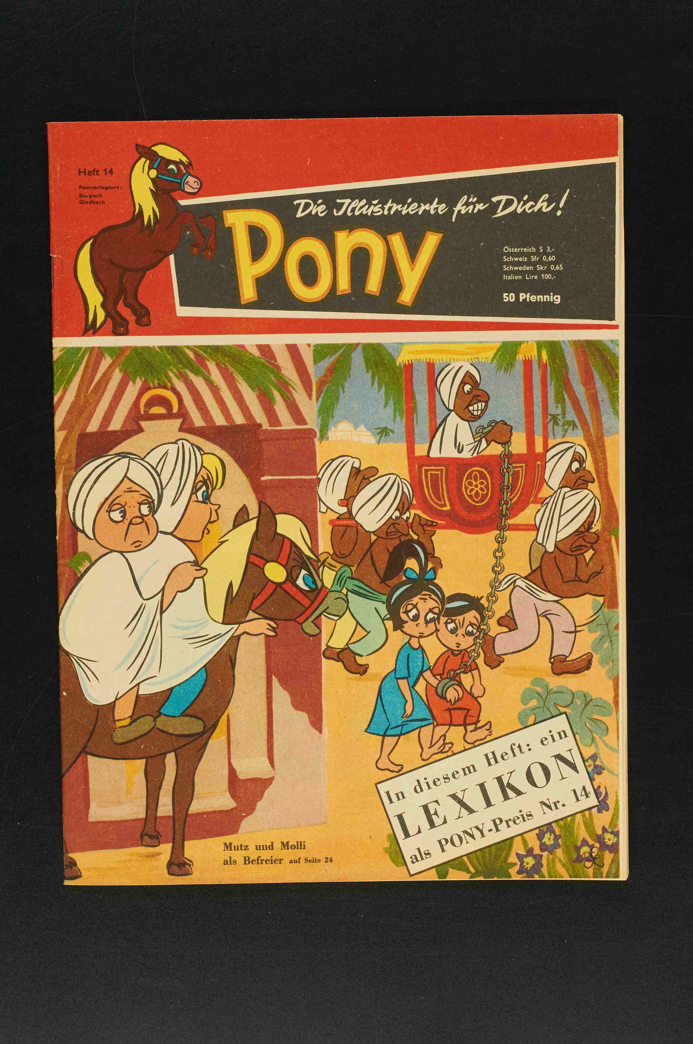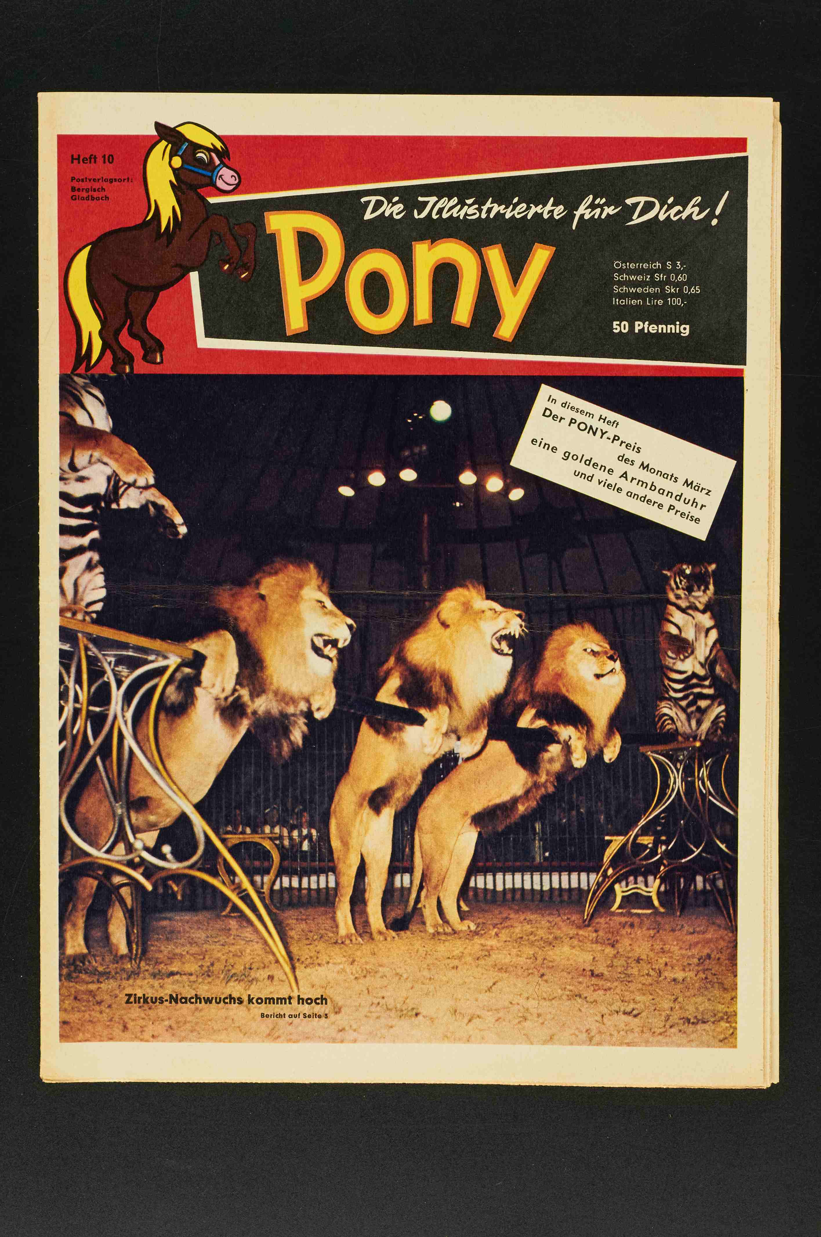 Pony Nr. 13 Eine stärkere Lagerfleckigkeit ist vorhanden insnbesondere an der Rückseite und am oberen Coverrand, dort auch ein mini Fehlstück, das noch beiliegt. Der Falz ist unten ca. 2,5cm offen, ein "Sonderpreis für Berlin" -Stempel am Cover und drei Datumsstempel, davon einer am Cover, sind vorhanden. Kleine Einrisse, Kantenblitzer und Druckspuren kommen vor.