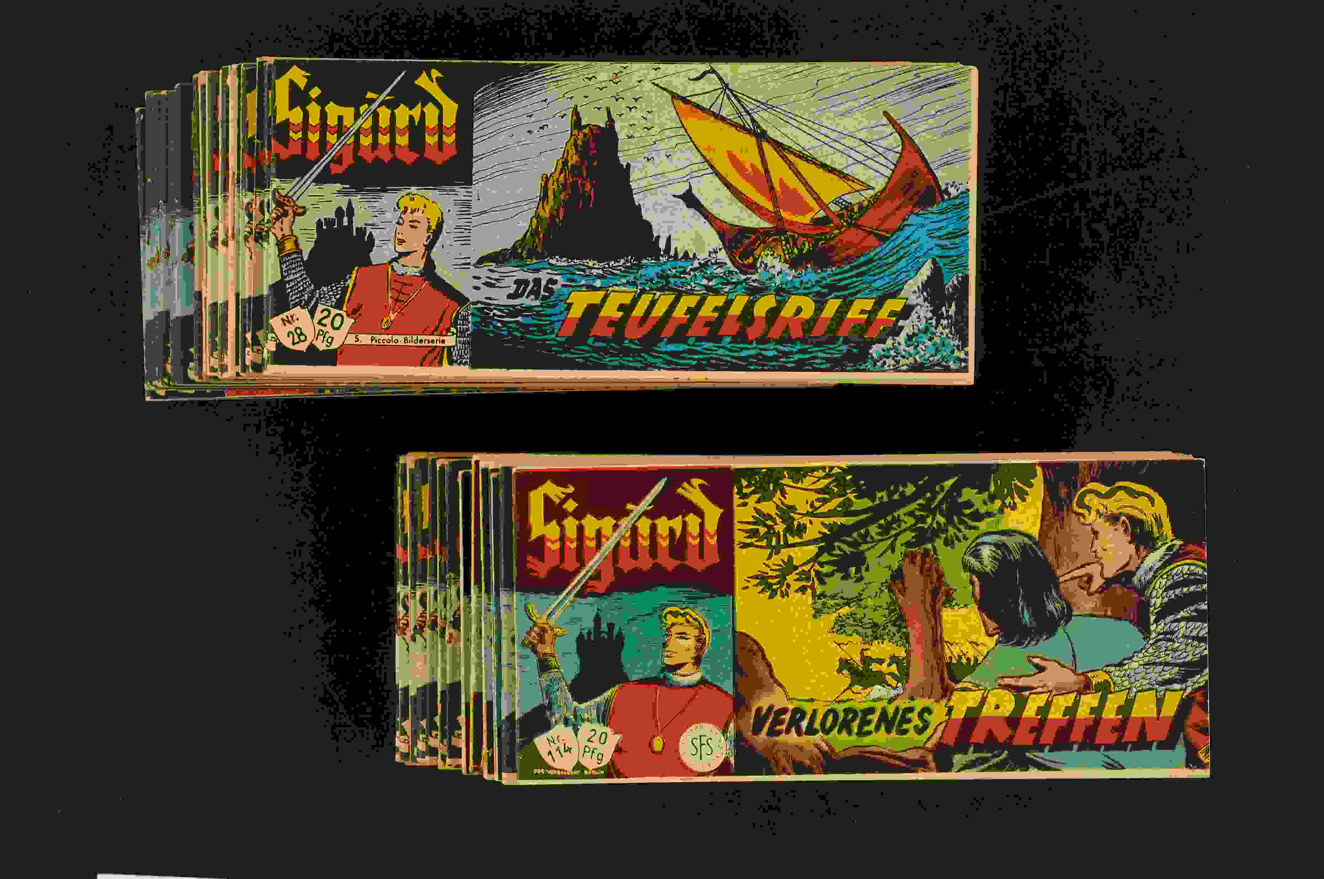 Sigurd 20 Pf. Serie Konvolut 35 Stk. Hefte 2, 3, 5, 9, 10-14, 16, 18-20, 22, 24, 25, 27-31, 33-36, 38, 63, 102, 104, 105, 108, 109, 111, 114 sind drin. Optik u. Substanz, meistenteils sehr fein, aber alle ohne Klammer. An der Mittelseite befindet sich sehr oft Klammerrost, in verschiedenen Intensitäten, ein Teil der Hefte, zeigt zusätzlich noch einige meistens leichte Mankos. Keine Fehlstücke,Tesa oder Stempel. Hefte mit leichtem Klammerrost um (2-3) bewertet, mit stärkerem Rost o. zusätzlichen Mankos um (3), ergibt in Summe eine Bewertung um (2-3/3).