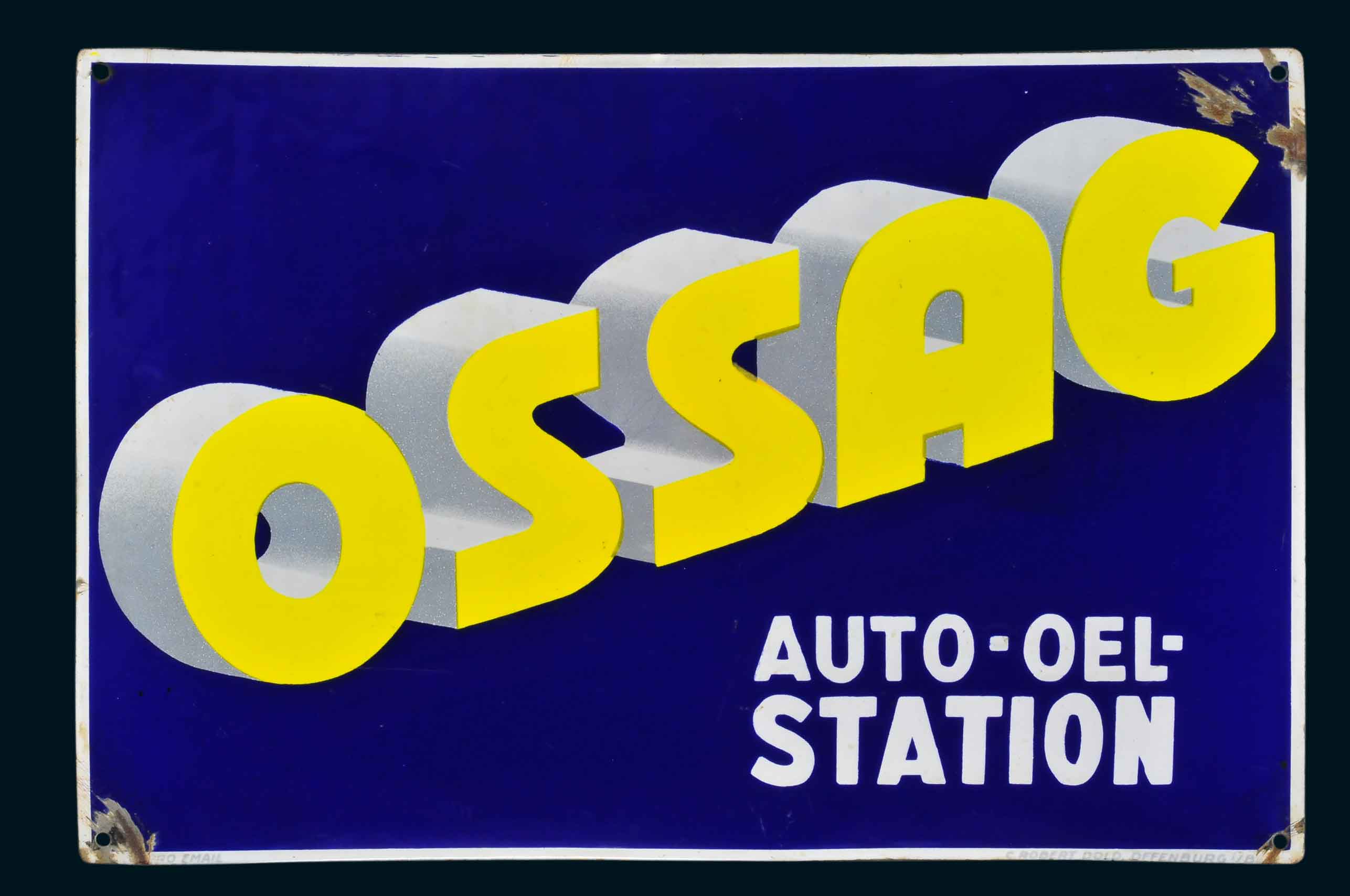 Ossag Auto-Oel-Station 50 x 33 cm, gewölbt, Ferro-Email, C. Robert Dold, Offenburg i. Baden, schabloniert.