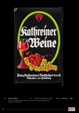 43 43 Kathreiner Weine (1) München und Hamburg, um 1920 (1.800,-) Limit Euro: 600,- 33 x 50 cm, gewölbt, Torpedo-Email, Frankfurter Emaillirwerke Neu-Isenburg, schabloniert, sehr selten 12