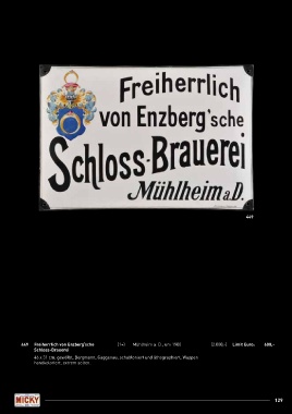 449 449 Freiherrlich von Enzberg‘sche (1+) Mühlheim a. D., um 1900 (2.000,-) Limit Euro: 600,- Schloss-Brauerei 46 x 31 cm, gewölbt, Bergmann, Gaggenau, schabloniert und lithographiert, Wappen handkoloriert, extrem selten. 129