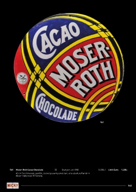 561 561 Moser-Roth Cacao Chocolade (0) Stuttgart, um 1900 (3.500,-) Limit Euro: 1.200,- 40 cm Durchmesser, gewölbt, zuckergussartig emailliert, eine absolute Rarität in dieser makellosen Erhaltung. 163