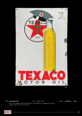 313 313 Texaco Motor Oil (2-3) Belgien, 1934 (2.000,-) Limit Euro: 650,- 50 x 75 cm, gewölbt, Emaillerie Belge Brux., schabloniert und umgedruckt, signiert: Delamare & Cerf, Brux., sehr selten. 87