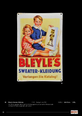 80 80 Bleyle’s Sweater-Kleidung (1-2) Stuttgart, um 1920 (3.000,-) Limit Euro: 1.250,- 33 x 50 cm, gewölbt, Motiv und Schrift lithographiert, an den weißen Rändern teils sichtbar mit Farbe ausgetupft, sehr selten. 24