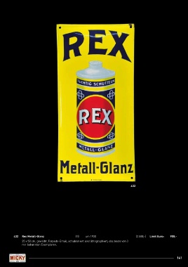 432 432 Rex Metall-Glanz (1) um 1920 (2.500,-) Limit Euro: 900,- 25 x 50 cm, gewölbt, Torpedo-Email, schabloniert und lithographiert, das beste von 3 mir bekannten Exemplaren. 141