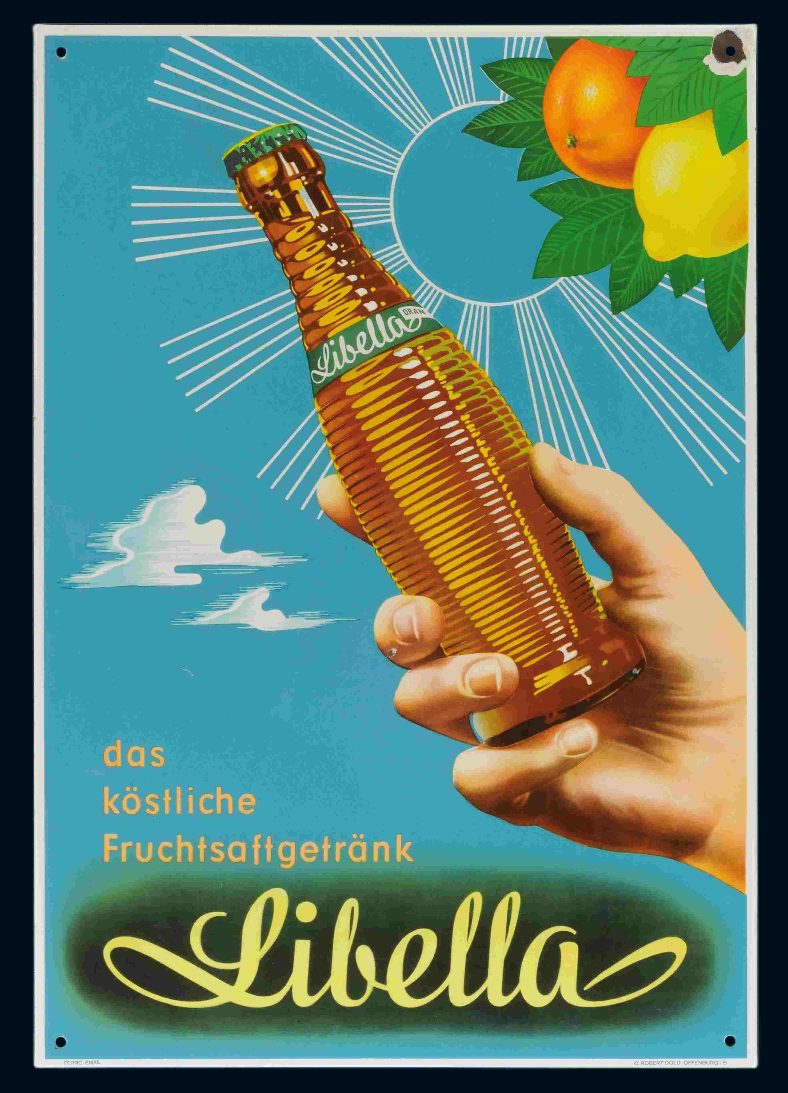 Libella Fruchtsaftgetränk 58 x 83 cm, abgekantet, Ferro Email, C. Robert Dold, Offenburg i. Baden, schabloniert und lithographiert, eine erbsengroße Verletzung im Mittelfinger. Sehr selten. Weitere Bilder |