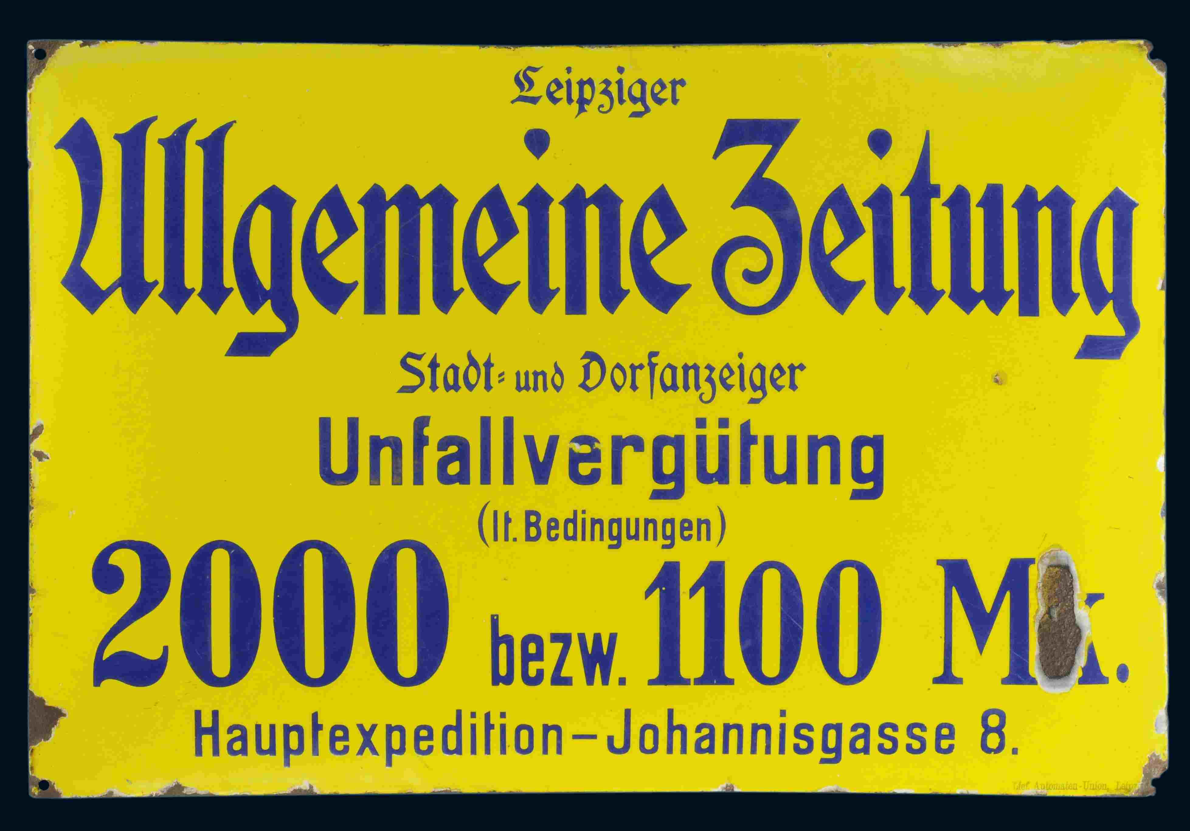 Leipziger Allgemeine Zeitung 74 x 50 cm, gewölbt, schabloniert, unten rechts bezeichnet: "Lief. Automaten-Union, Leipzig". Weitere Bilder |