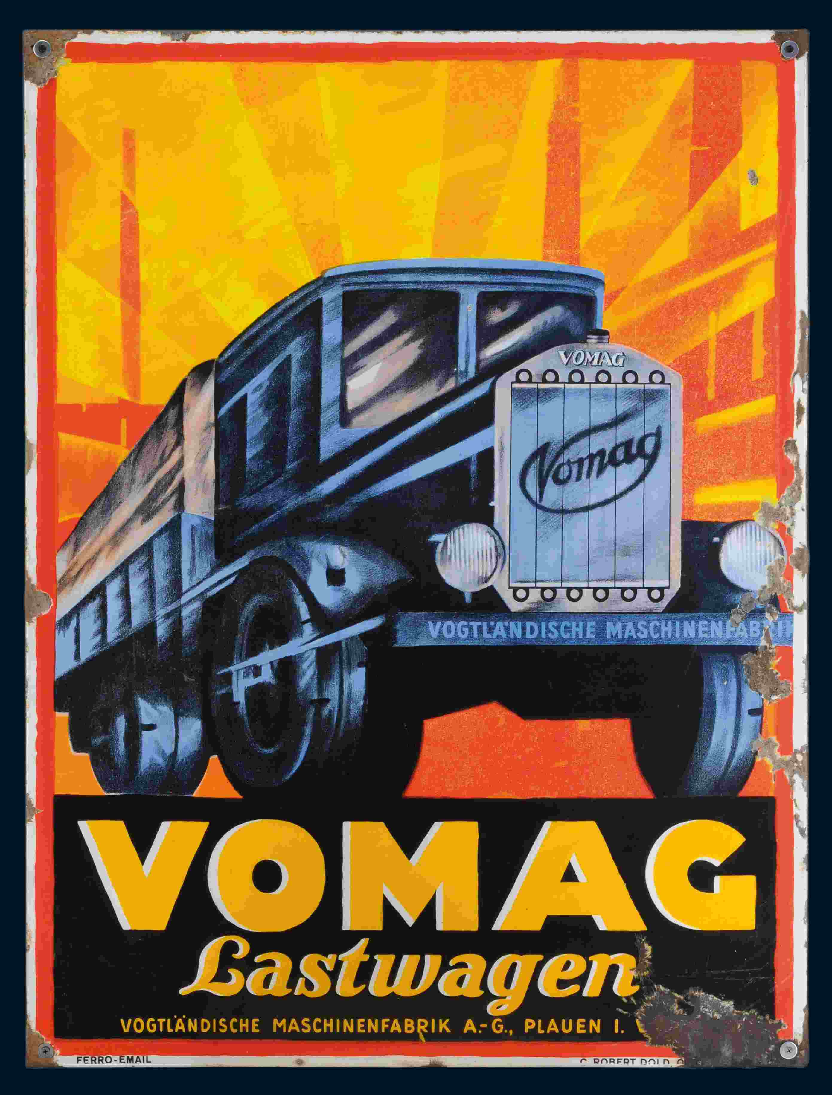 VOMAG Lastwagen 73 x 98 cm, abgekantet, Ferro Email, C. Robert Dold, Offenburg i. Baden, schabloniert und lithographiert, farbintensiv, sehr schöner Glanz, auf Holzplatte montiert. Ein sehr seltenes Schild, das vermutlich auch nicht in großer Auflage produziert wurde; wer kaufte schon einen LKW... Der Entwurf ist von unbekannter Künstlerhand. Der Lastwagen aus der Ameisenperspektive gesehen verbunden mit angedeuteten Geschwindigkeitslinien und vor allen Dingen der glühend strahlende Hintergrund, der die Industrialisierung aufregend verdeutlicht. Wenn ich das Schild anschaue, höre ich krachende Dampfhämmer, sehe ich den Funkenflug des glühenden Eisens, spüre ich die Hitze der Schmelzöfen. Welch grandioser Entwurf. Dieses Schild war bereits in der letzten Auktion, wurde jedoch nicht bezahlt. Daher biete ich es heute erneut an. Weitere Bilder |